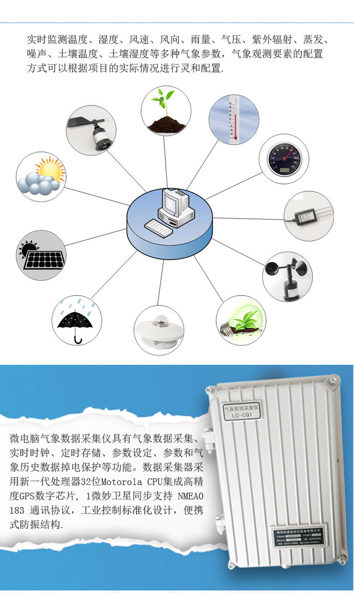 2、微電腦氣象數據采集儀具有氣象數據采集、實時時鐘、定時存儲、參數設定、參數和氣象歷史數據掉電保護等功能。數據采集器采用新一代處理器32位Motorola CPU集成高精度GPS數字芯片, 1微妙衛星同步支持 NMEA0183 通訊協議主動型陶瓷天線讓定位更為精準,通過氣象監測軟件可以準確定位查看監測區域的氣象環境數據,方便于移動觀測氣象數據,工業控制標準化設計,便攜式防振結構,漢字液晶鍵盤人機界面,使用先進的雙屏顯示技術,主屏顯示實時氣象數據信息,輔屏顯示地理狀況信息包括方位、高度、天氣預報資料等等,人機界面友好,便于現場實時查看氣象分析數據,無需外接電腦終端設備。