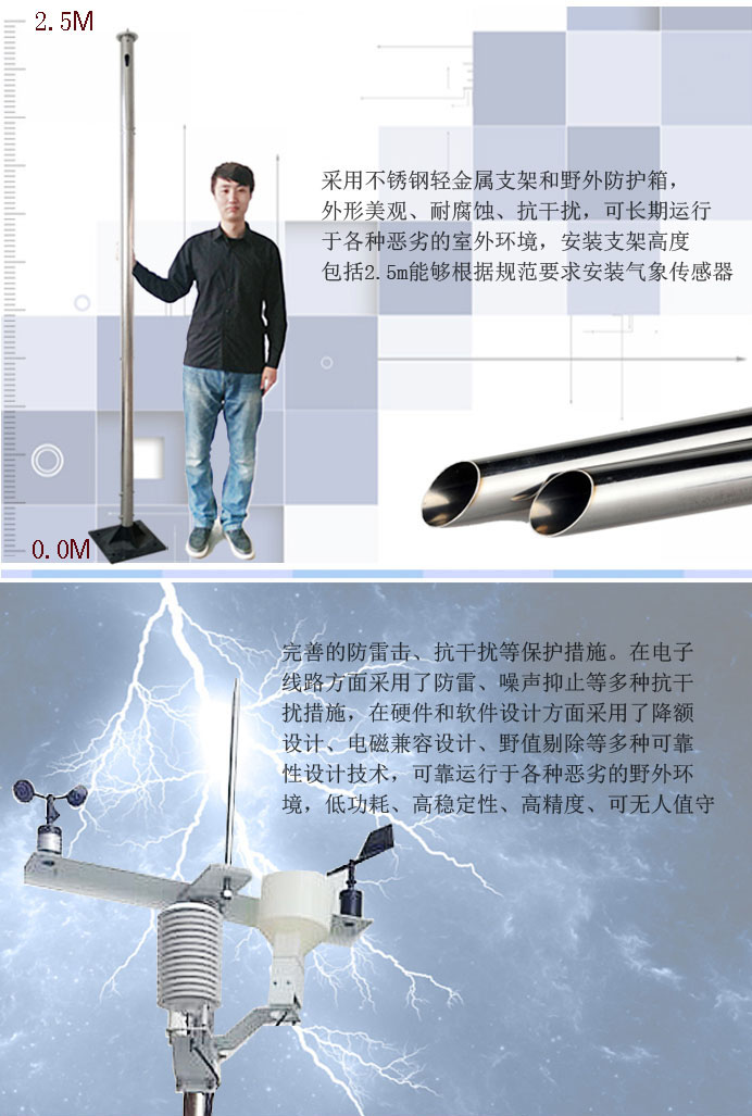 6采用不銹鋼輕金屬支架和野外防護箱,外形美觀、耐腐蝕、抗干擾,可長期運行于各種惡劣的室外環境,安裝支架高度包括2.5m能夠根據規范要求安裝氣象傳感器。
